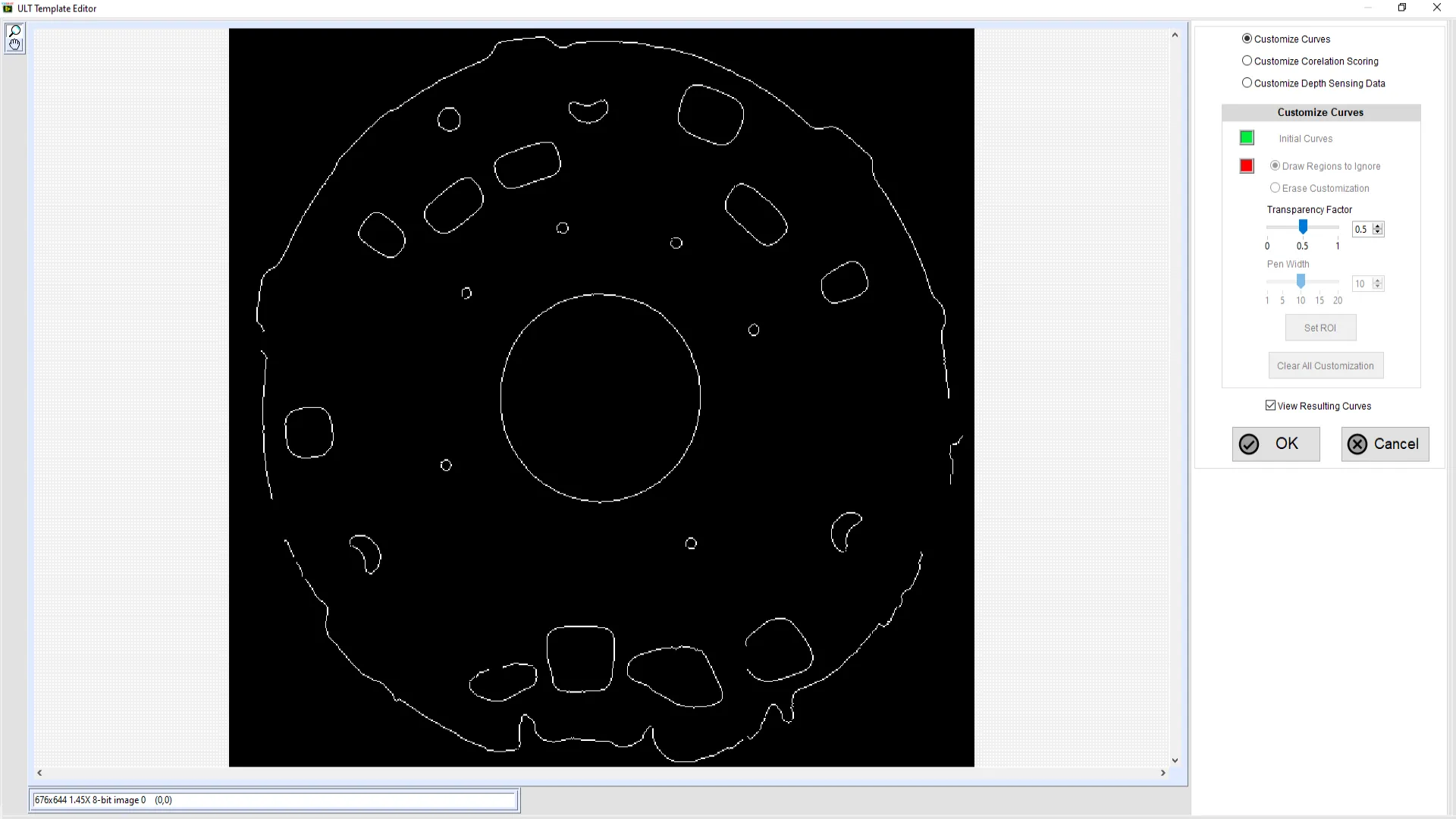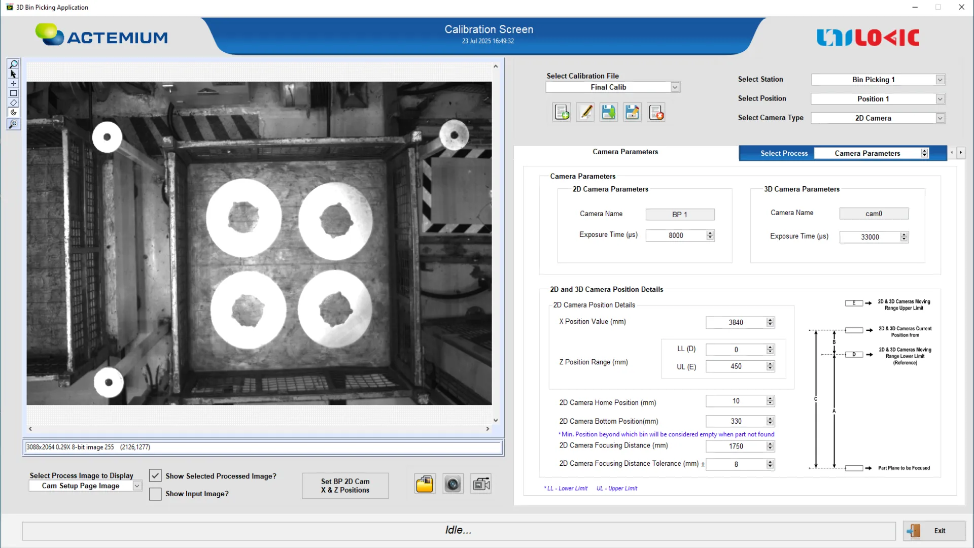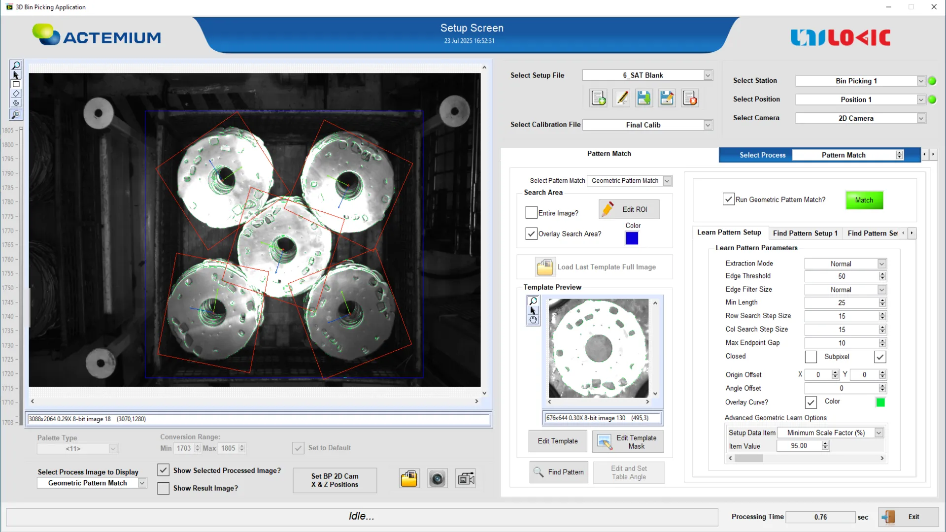 - A 2D area scan camera is used to detect the X and Y coordinates of the parts through pattern matching techniques.
