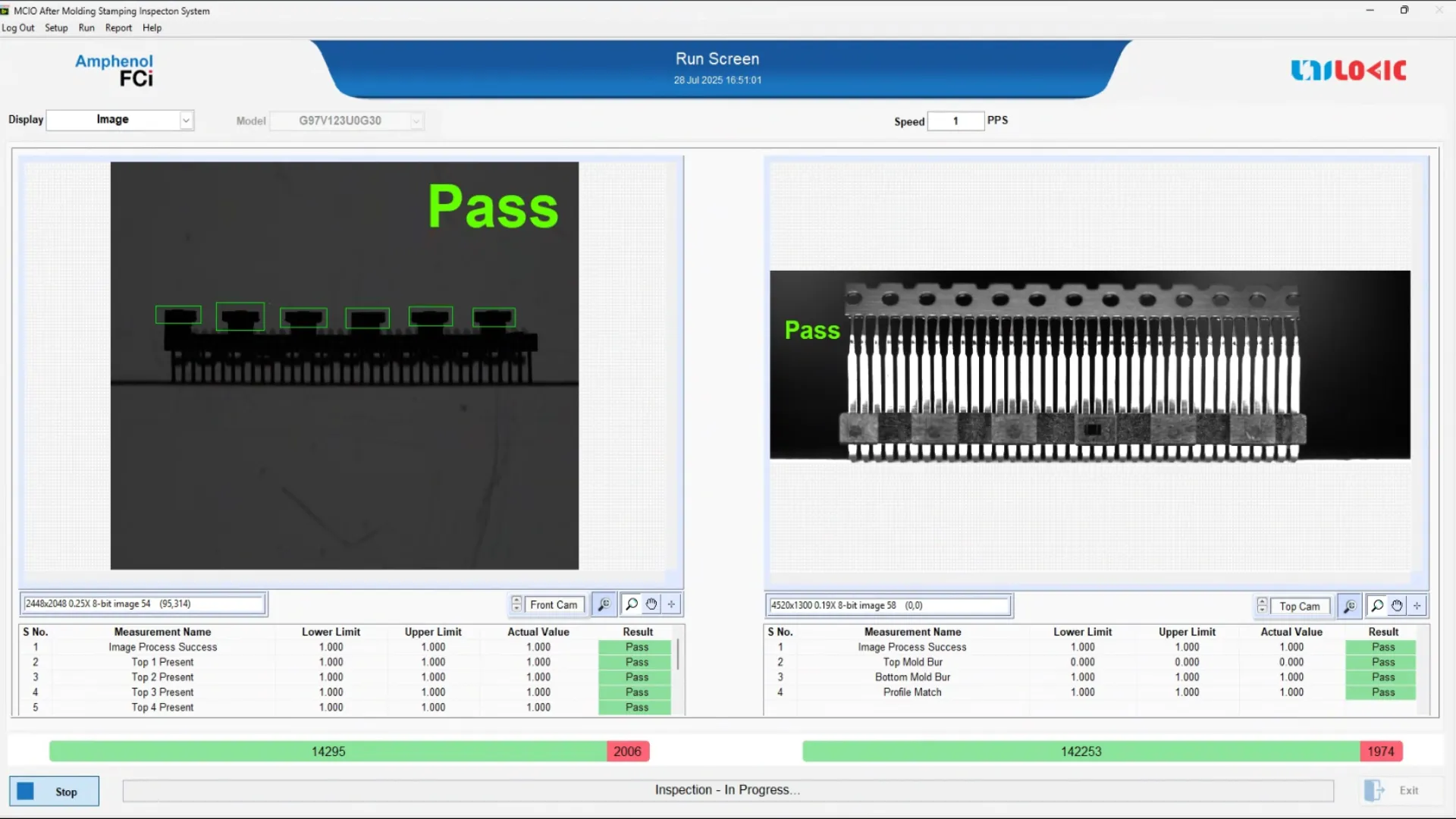 - Top Camera: A 20 MP area scan camera, mounted directly above the connector, performs high-resolution analysis to detect:
