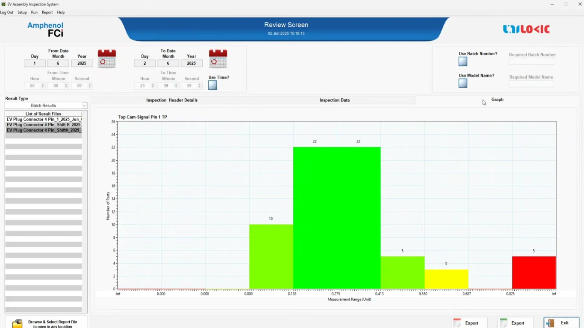 - Report generation in Excel, PDF, with SPC reports and bar charts